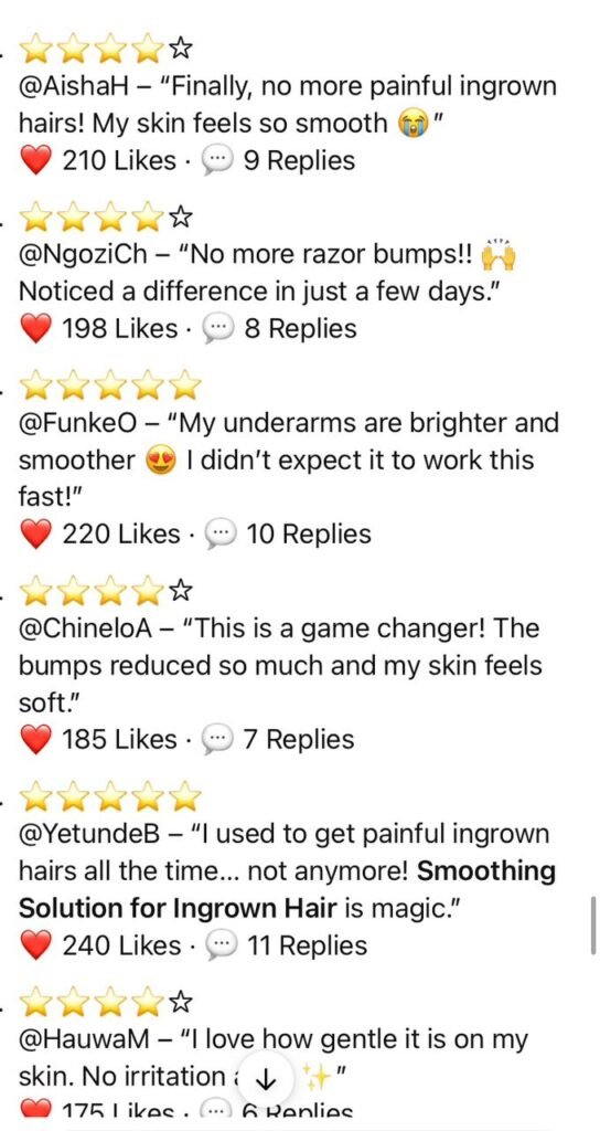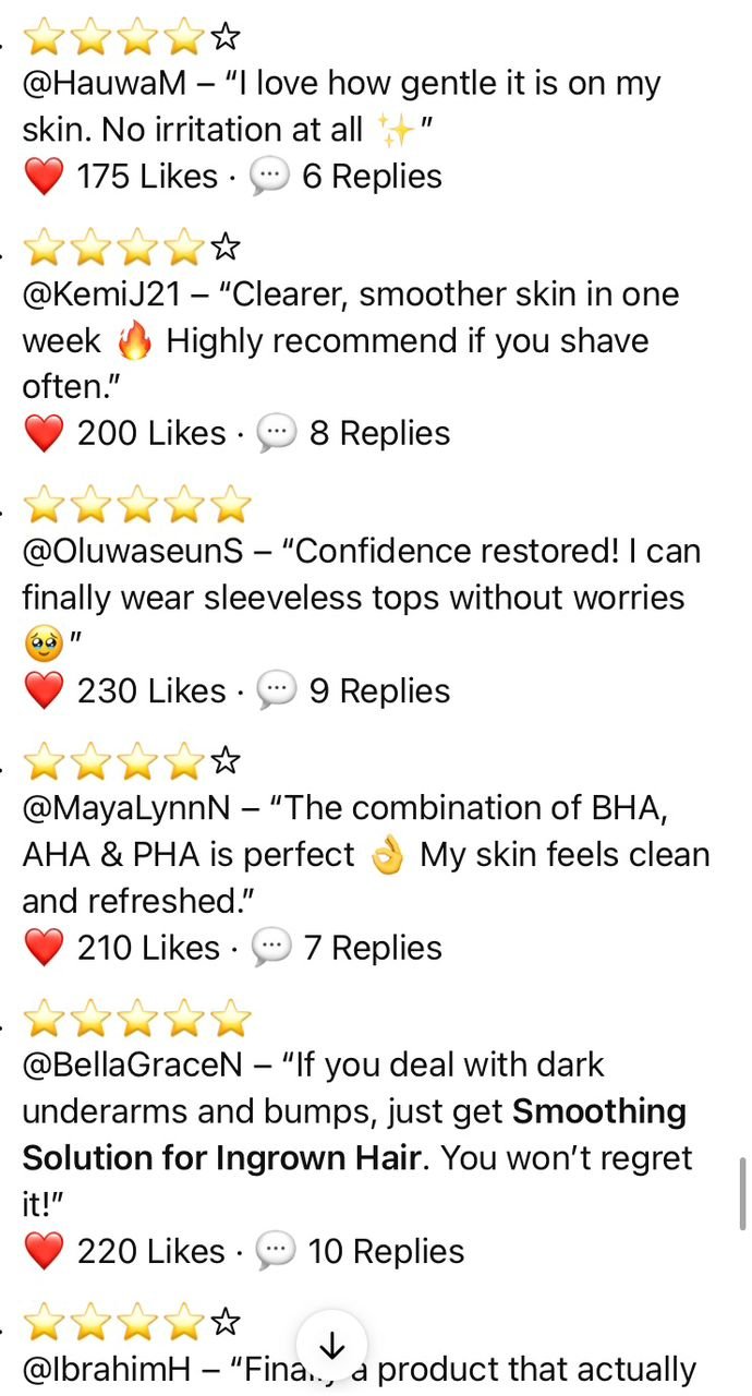 Smoother skin- reveals irresistibly smooth skin. Very few/no ingrown hairs- puts an end to painful and irritating ingrown hair. Very few/no razor bumps- enjoy smoother, irritation-free skin. Brighten dark armpit- reveals brighter, smoother underarms you will love to show off.